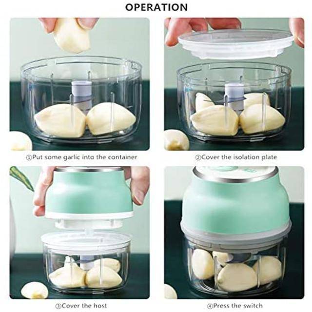 - [Powerful Function] Powered by USB, rechargeable. Press the button on the top to automatically stir the food. The sharp blades of the garlic chopper are quick to chop garlic, seasoning, nuts, vegetables, meat, ice cubes, and more, perfect for small foods. You can use it for cooking, baby food supplements, smoothie drinks.